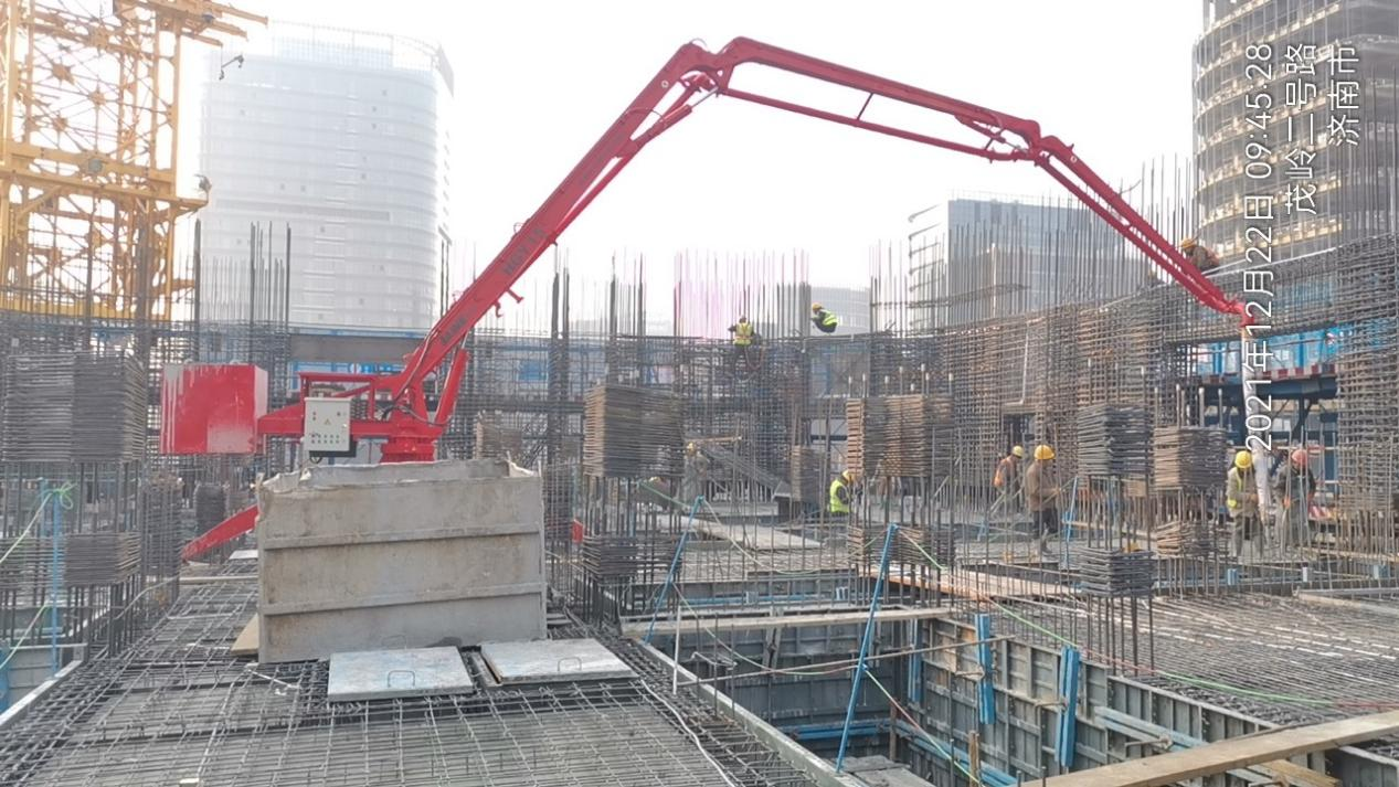濟(jì)南復(fù)地國際金融中心260米超高層項(xiàng)目將建53層超高層辦公塔樓一棟,最高處達(dá)260米。該項(xiàng)目總建筑面積128680平方米,地上總建筑面積126267平方米,地上包含辦公、商業(yè)功能區(qū)。地下建筑面積2213平方米。其室外地坪至最高點(diǎn)達(dá)260米。A1地塊總停車位757輛。該項(xiàng)目使用的布料機(jī)為凱博科技生產(chǎn)的HGY15移動式布料機(jī)。