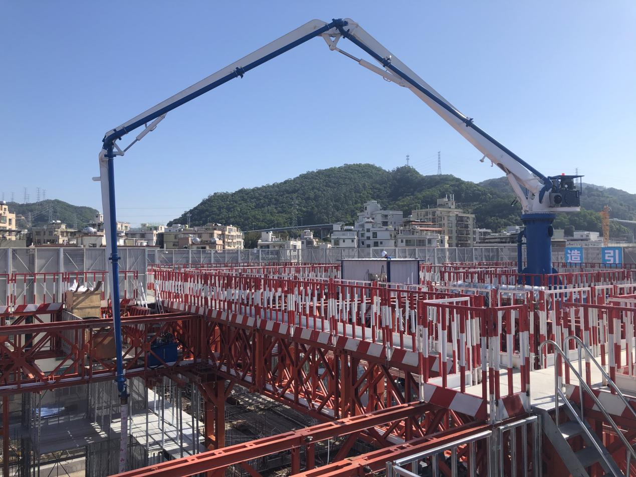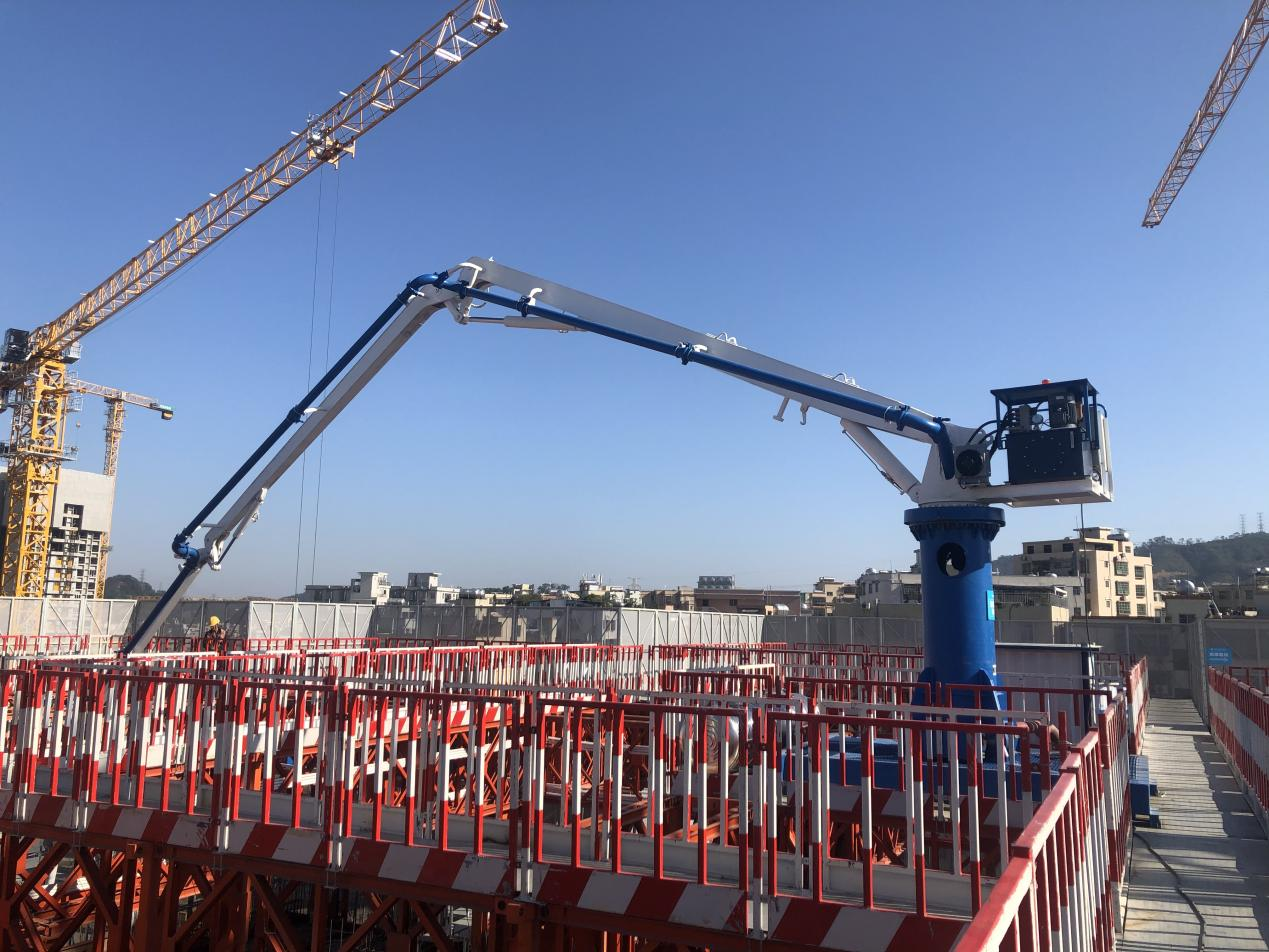 模架式液壓混凝土布料機自帶鋼平臺底座,與爬模架體連接傳遞施工載荷,無需自帶動力系統,爬模爬升時帶動其爬升。其中HGY21模架式液壓混凝土布料機于2021年11月成功應用在使用“住宅造樓機”的裝配式建筑領域(中建三局承建的廣州大源村項目)。